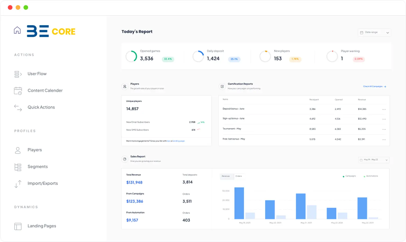 All relevant data can be integrated and synchronized into the BE Core. Save your preferred settings and navigate with a few clicks between "new player registrations" and "game performance reports" – it is that simple. Bejoynd has conducted extensive testing to design and deliver the most optimal Back Office on the market.